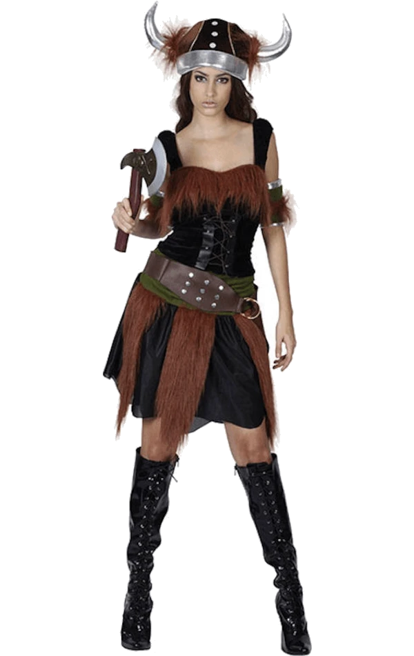Become a Nordic princess with the Womens Viking Costume, complete with horned headpiece, top and skirt with brown fur trim. Ideal for a Viking fancy dress party, this costume is the perfect balance of tough guy and sexy girl, so pair it up with an axe to complete the look!