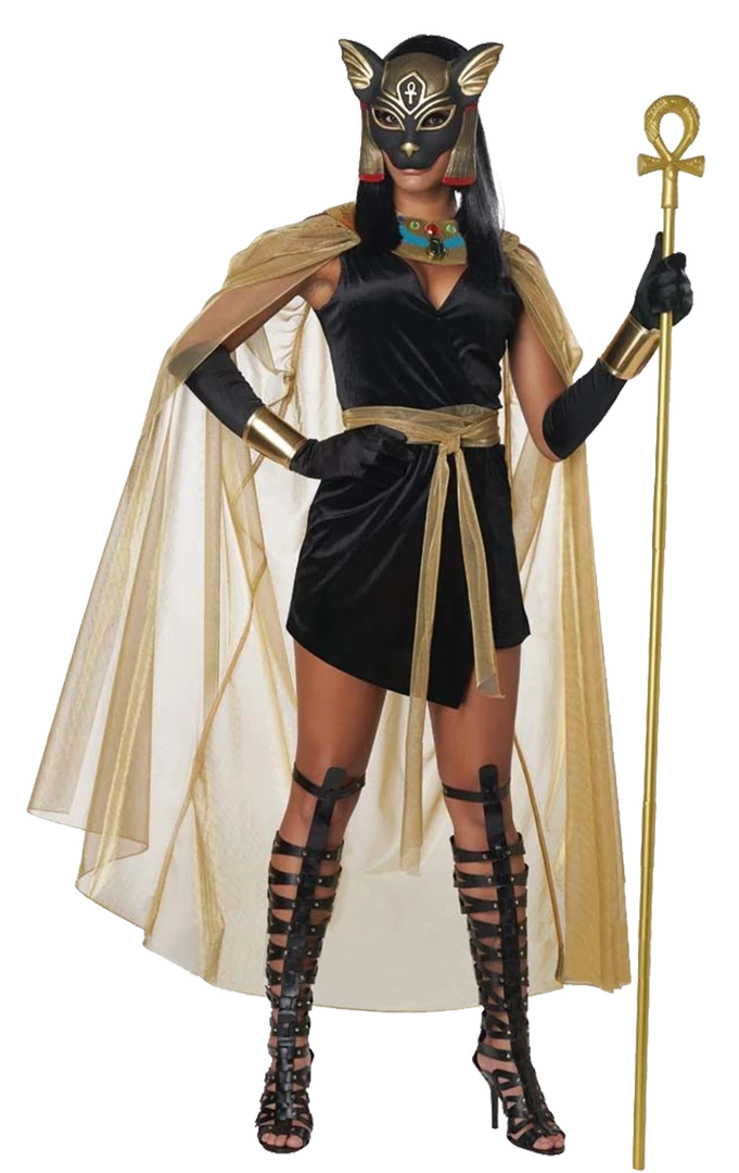 Become the beautiful ancient Egyptian Bastet the Cat, Goddess of Protection in the Womens Bastet Egyptian Goddess Costume. This sexy and slick high-quality costume features a black wrap dress with a plunging neckline, a gold sheer fabric belt, a matching cape attached to an Egyptian collar, gold wrist cuffs and a black and gold cat facepiece. Team up with a Pharaoh for the ultimate couples costume whether you’re celebrating Halloween or attending an Around The World themed party.