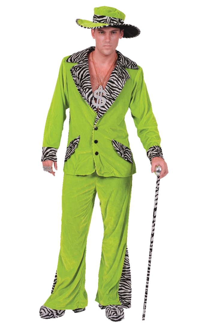 The Adult Green Pimp Costume is made up of a vibrant green, velvet-like suit jacket, with a pair of matching trousers. The jacket features zebra print detailing on the collar, pockets and sleeves, as well as down the sides of the trousers, creating a bold, statement look. Completing the look is a matching green and zebra print hat. Add a classic pimp cane and you’ll be demanding respect on the dancefloor!