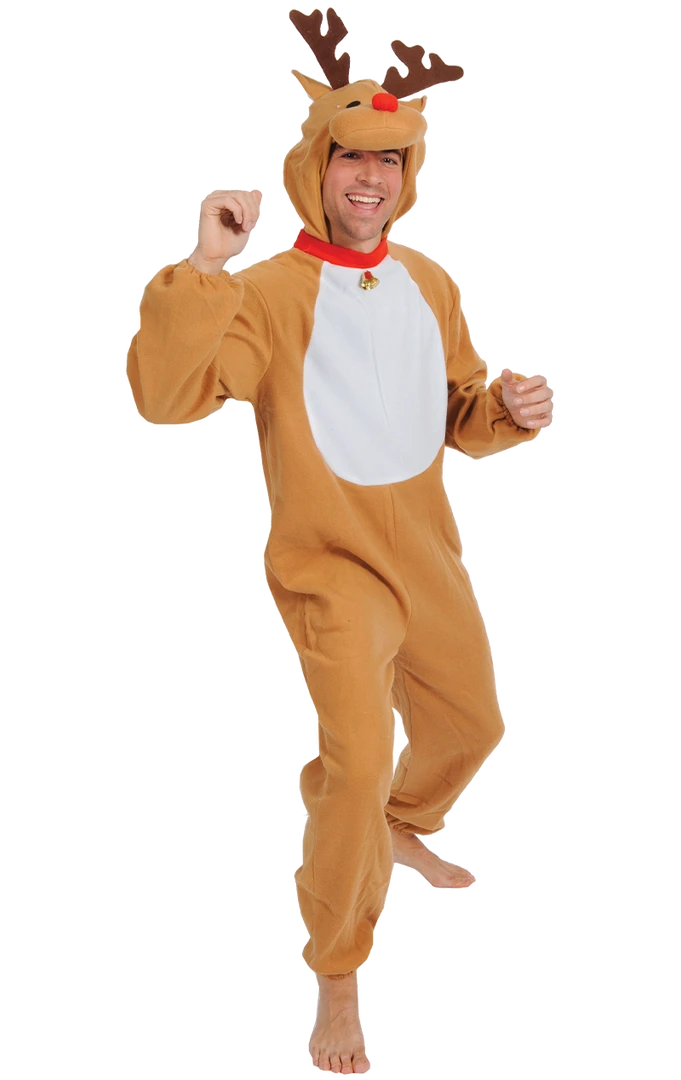 Our Adult Red Nosed Reindeer Costume is an all-in-one fleece onesie with a hood that’s printed with a reindeer face and the iconic red nose. A pair of antlers are attached to the head to complete the look.
