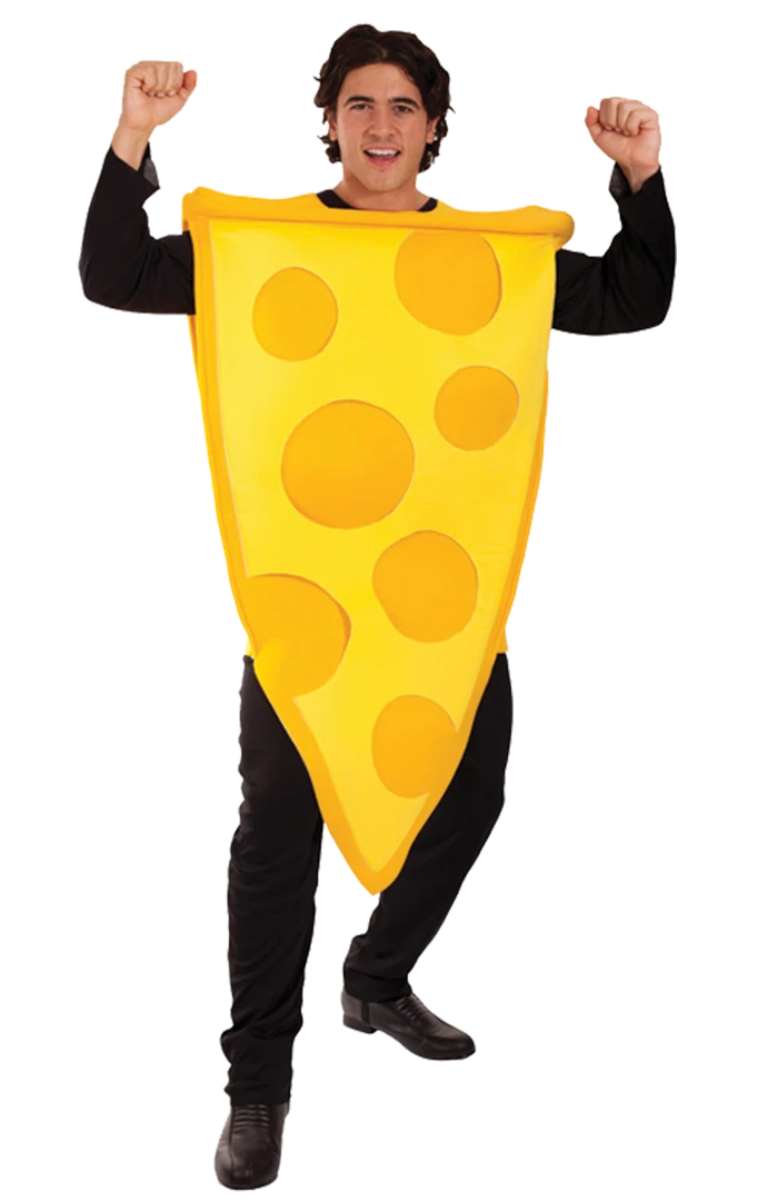 The Adult The Big Cheese Costume includes a large tunic in the shape of a slice of cheddar cheese. The tunic is comfortable and easy to slide over the head and will have you looking super tasty all night long.