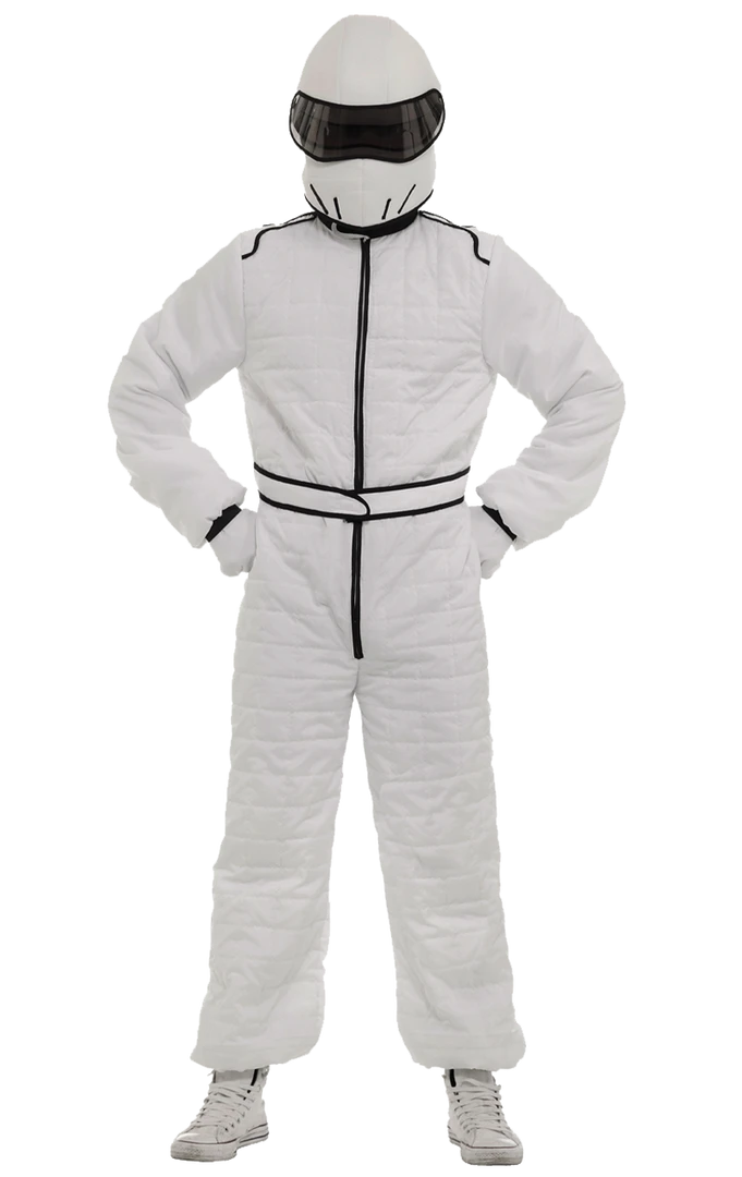 The Adult Top Gear The Stig Costume is made up of an all-in-one white jumpsuit with black detailing around the zip, cuffs and waist. The costume also includes a pair of matching white gloves and the all-important race helmet to disguise your identity.