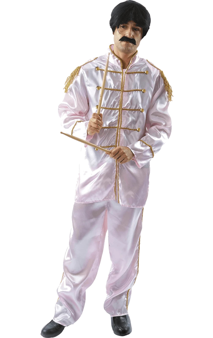 The George Harrison Beatles Costume is made up of a long, satin, military-style suit jacket. It’s in a retro shade of pale pink, with a high collar and gold detailing on the front, shoulder pads with a gold tassel trim, and metallic gold rope details down the centre. The costume also comes with a matching pair of satin-style pink trousers with an elasticated waistline, for a flexible and comfortable fit.