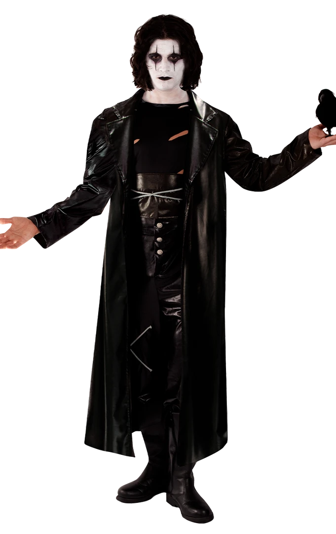 The Adult The Crow Movie Costume is made up of a leather-look black jacket with matching leather-look trousers. It also includes a black top and belt. All you need extra is some white and black face paint, creating the unique look of this devious movie character.