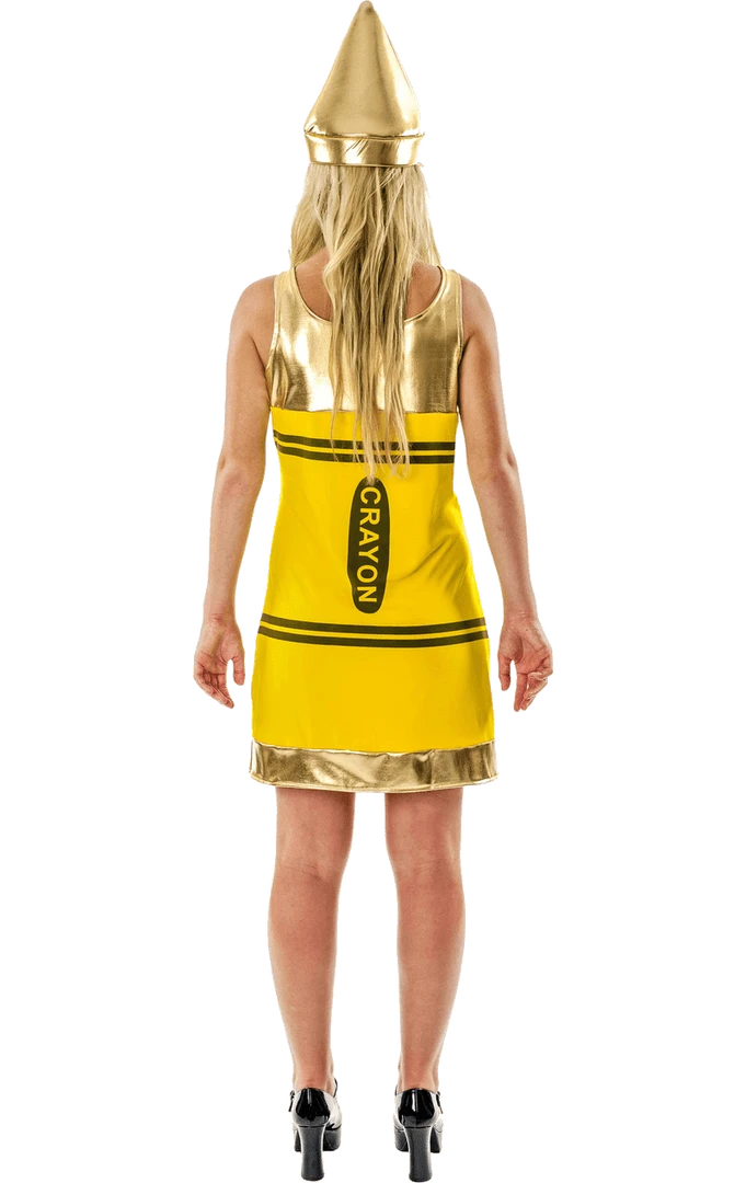 Brighten the party with this fun Womens Yellow Crayon Dress Costume. Grab a group of friends and party the night away in these cute little dresses with shiny details.