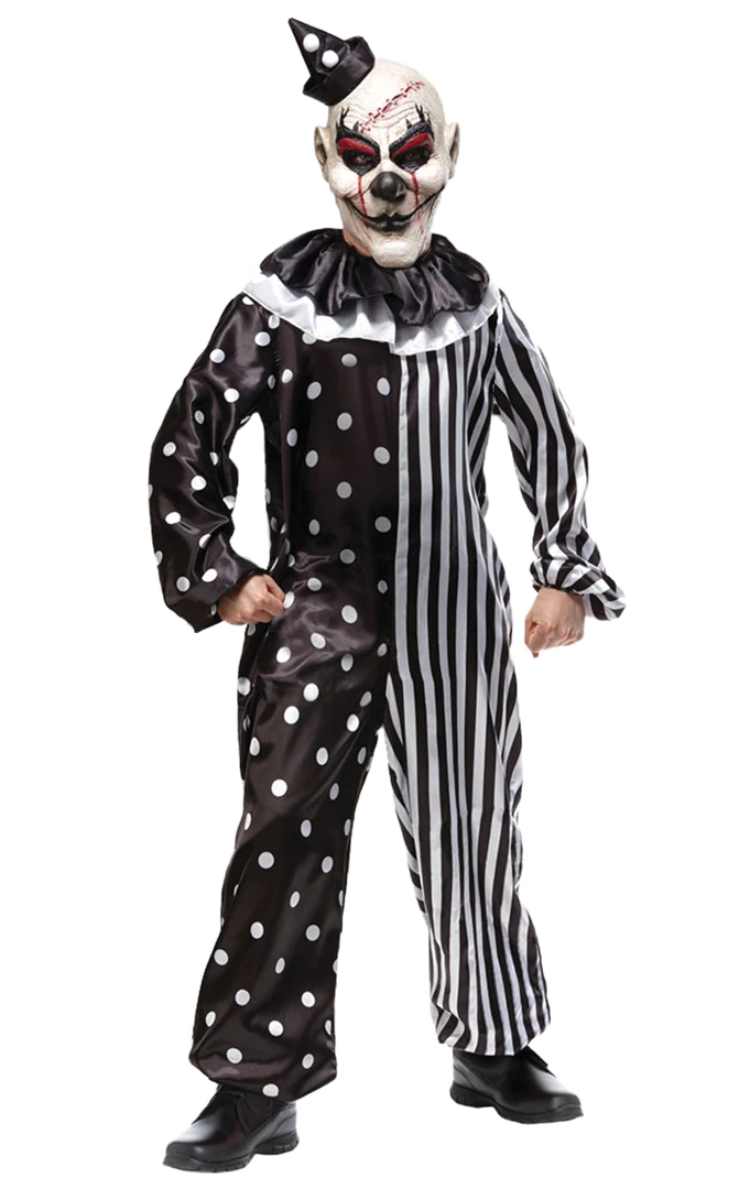 Be the stomping and slashing Killjoy Clown this frightful Halloween! Send trick-or-treaters into a frenzy with this eerily creepy costume for kids. Arrive at the party and scare even the adult in this costume, it’s perfect for Sinister Circus fancy dress too!