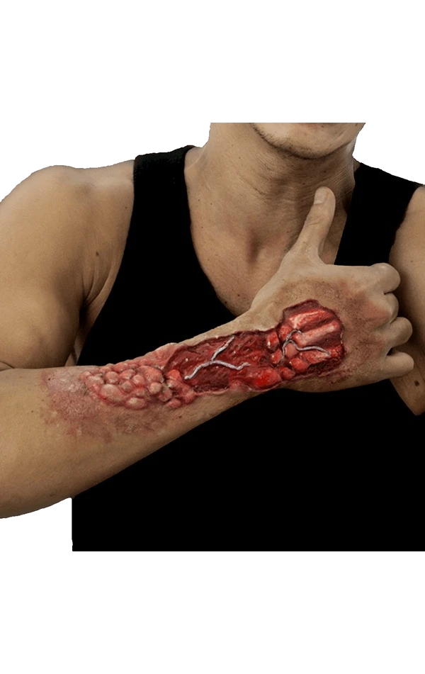 Look like you’ve caught the epidemic of the flesh eating bugs with the Woochie Eaten Away SFX. This special effects transfer is an easy way to create the gory looks that professionals spend hours creating. In a few easy steps, you can look like your skin has rotted away to reveal bone and the skin has blistered – ideal for Halloween zombie fancy dress. Purchase this SFX transfer along with Liquid Latex, Fake Blood and either Water-Soluble Mastix or Spirit Gum & Spirit Gum Remover.Â