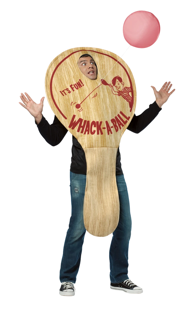 Looking for something wacky and fun for your next fancy dress? Throw it back to your childhood with this Adult Paddle Ball Costume thats interactive! Featuring a wood effect board shaped bodysuit and attached inflatable ball, you can be assured this one will be entertaining all night long.