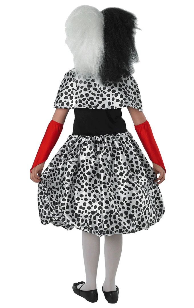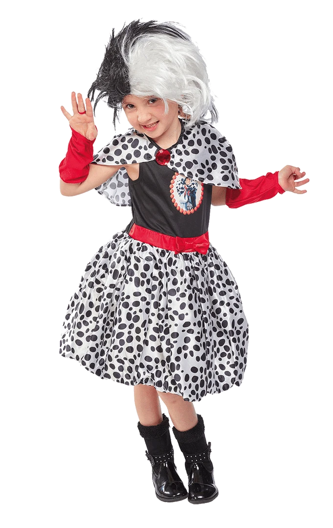 The children’s Cruella De Vil costume is made up of an all-in-one dress with Dalmatian print. A matching cape is included, as is a pair of sleevelets. All she needs extra is a Cruella De Vil wig, which can be bought separately.