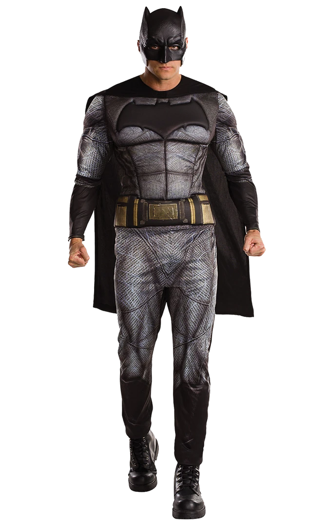 The Adult Justice Batman Costume is made up of a long-sleeved jumpsuit that’s printed with the style of the first Batman suit seen in the movie. The jumpsuit features grey and black armour detail, as well as arm cuffs, boot covers, a utility belt, and of course, the iconic bat logo on the chest. The jumpsuit also includes padded muscles on the chest and arms to show off your superhuman strength. Completing the look is an attached black cape and a Batman facepiece. You have absolutely everything you need to transform into the one and only, Batman.