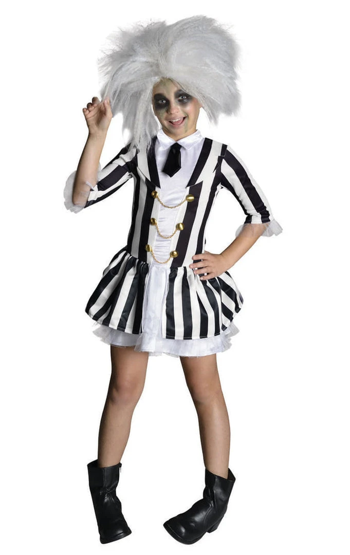 Say the name three times and he appears! Your girl will look like she’s crawled straight out of Tim Burton’s mind in this Kids Beetlejuice Girl Costume. Complete the look with the grey, crazy wig she’ll be ready to trick-or-treat in no time! This costume is also perfect for a movie party or Halloween night. The iconic black and white striped dress is a tribute to Michael Keaton’s suit from the movie.