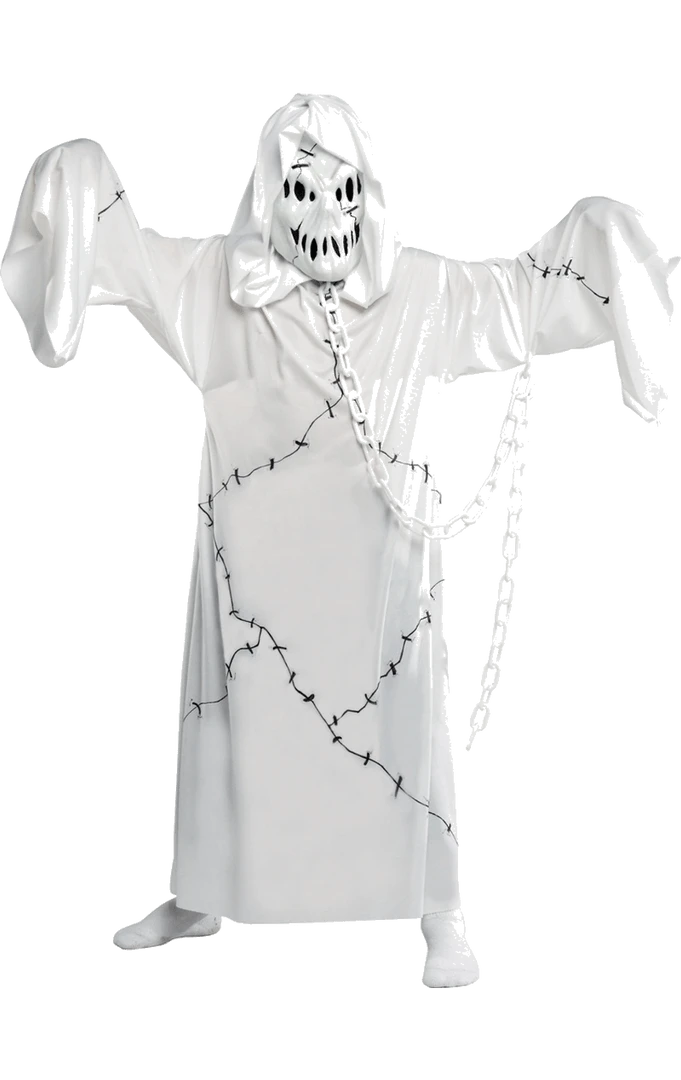 Only the brave shall wear such a creepy and ghoulish costume at Halloween… They will make strange noises, pounce from corners, laugh evilly and chase anyone they please! If this sounds like the perfect idea of fun for your kiddie, get them this Cool Ghoul Kids Ghost costume and watch all hell let loose! Whilst a plain white sheet is a Halloween winner every time, this children’s ghost costume takes it to the next level, with spooky face and body detail, flowing chains and long baggy sleeves. Ghosts and ghouls will is a trademark Halloween theme and this costume will be a big hit with your boy or girl.