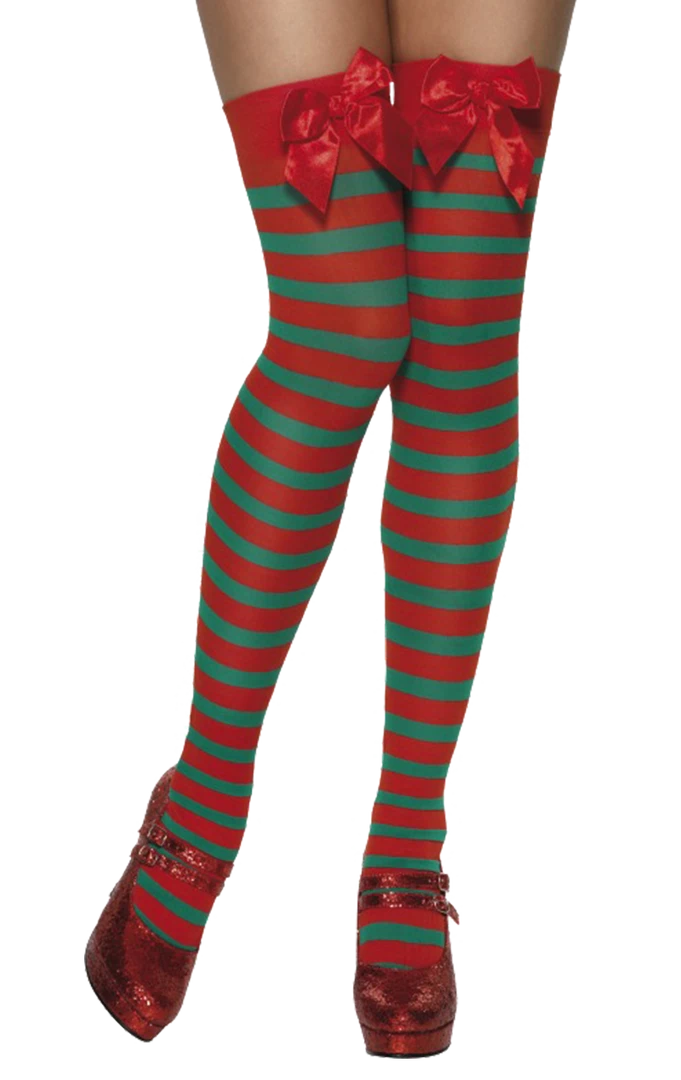 The Striped Elf Thigh High Stockings come in the festive colours red and green, with a satin red bow at the top to add a stylish and chic twist to your costume.