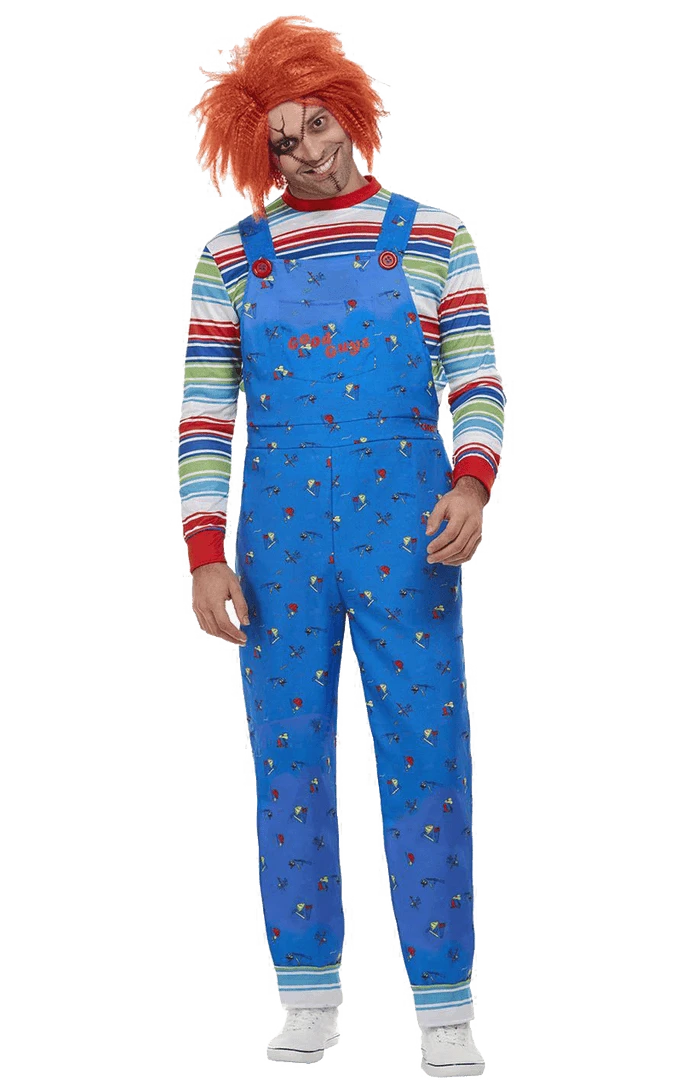 Become the bad-mouth killer doll that’s been possessed by the voodoo spirit of a serial killer this Halloween. The Mens Chucky Halloween Costume features the iconic blue ‘Good Guys’ dungarees and striped top so that you can look like you’ve jumped straight out of the Child’s Play movies. Ideal for Halloween, this horror=tastic mens Chucky costume just needs a weapon, some facial scars and a crazy wig to be completed. Get ready to spook trick-or-treaters with this horrifying doll costume!