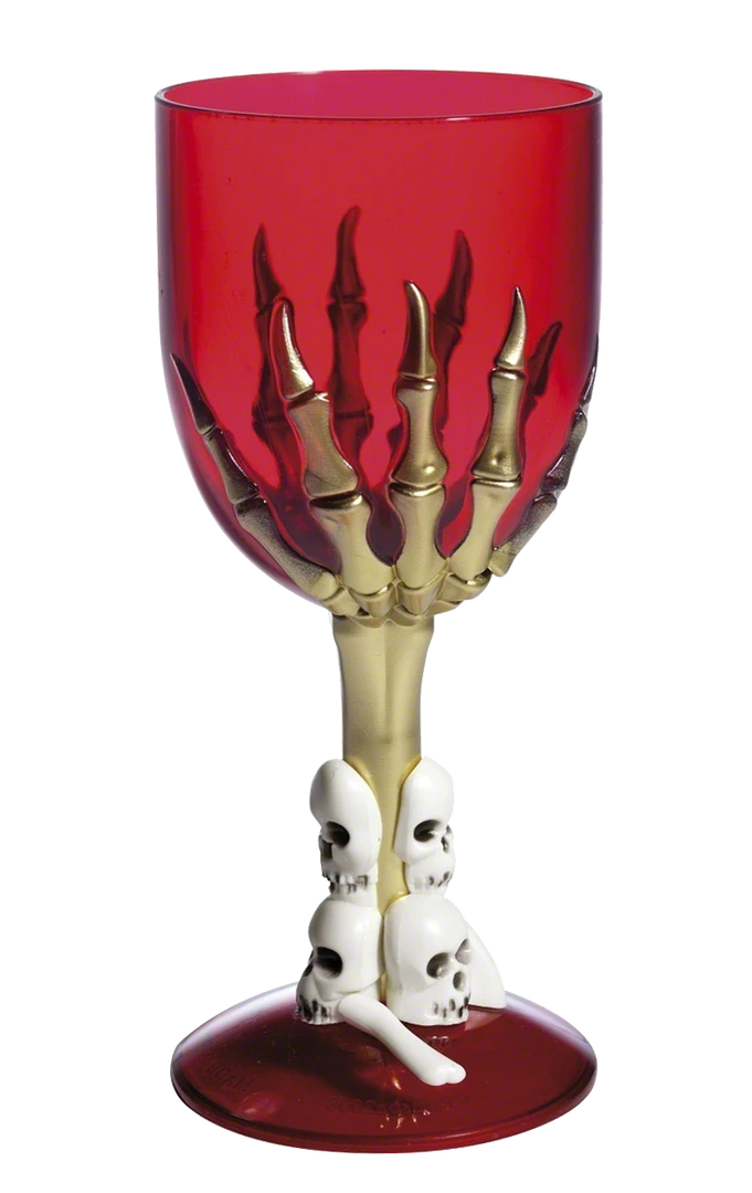 Gothic Wine Glass of red coloured plastic with gold skeleton and bone detailing.